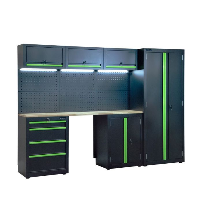 Beyond the main structure, the system is designed for usability: lockable compartments for security, ball-bearing drawer slides for smoother access, and a pegboard back panel that keeps frequently used items visible and within reach. Lift-up doors are supported with gas struts, while shelving and levelling features help the system sit correctly—even on uneven floors.