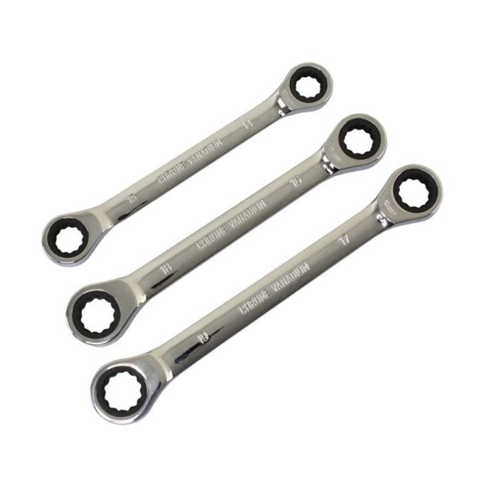 This set uses a double ring design, giving you ring ends on both sides so the wrench stays seated securely on the fastener. Inside each ring is a 72 tooth ratcheting gear, designed to turn fasteners in small increments for smoother work in restricted spaces. This makes it ideal for repetitive tightening and loosening where you would normally need to lift and reposition a traditional ring spanner again and again.