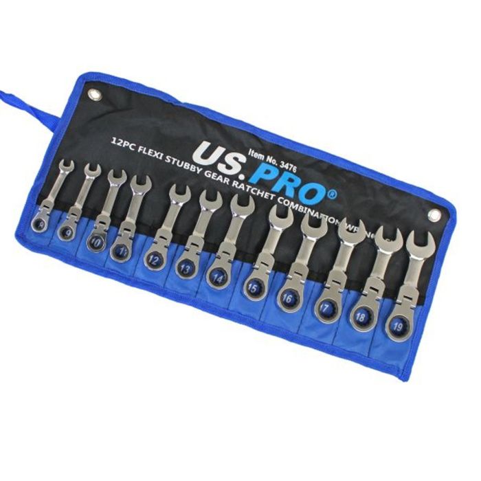 Modern vehicles and machinery often leave very little room to work, making standard length spanners impractical in confined areas. The US Pro 3476 Professional 12 Piece Flexi Stubby Gear Ratchet Combination Wrench Set is specifically designed to solve these access problems by combining a compact stubby profile with the speed and convenience of a flexible ratchet mechanism.