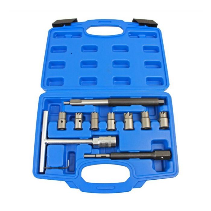 The set includes a centring pilot to guide the cutter accurately within the injector bore, along with a T-handle that provides controlled, even pressure during operation. This allows precise material removal while reducing the risk of misalignment or uneven cutting.