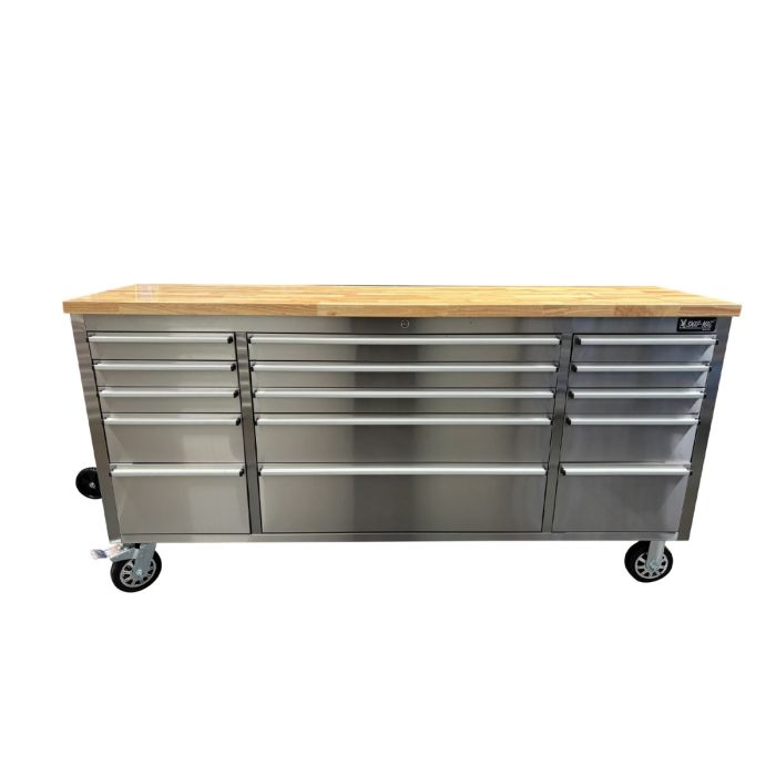 The US SNAP MAC 72in Stainless Steel 15 Drawer Work Bench Tool Chest Cabinet delivers robust storage and workspace performance for garages, workshops, and trade environments. Built with high-quality materials, it combines a stainless steel finish with a practical work surface and ample storage capacity.