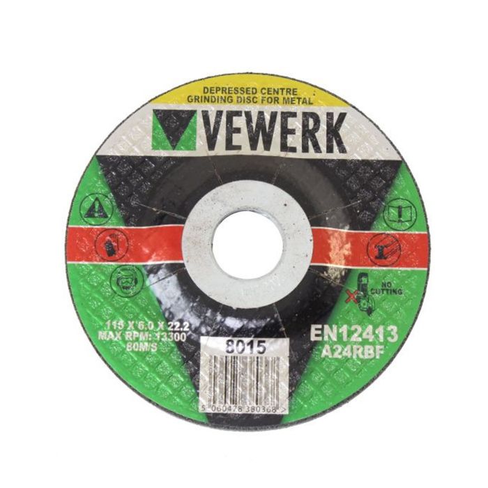 VEWERK 8015 115mm Depressed Centre Grinding Discs 6.0mm x 22.2mm (Box of 100) – Metal